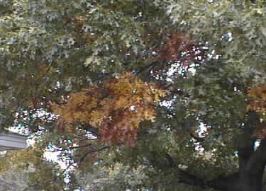 oak beside our driveway has a few orange and brown leaves. |